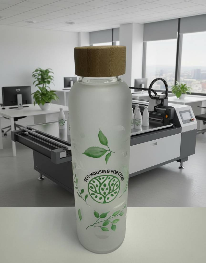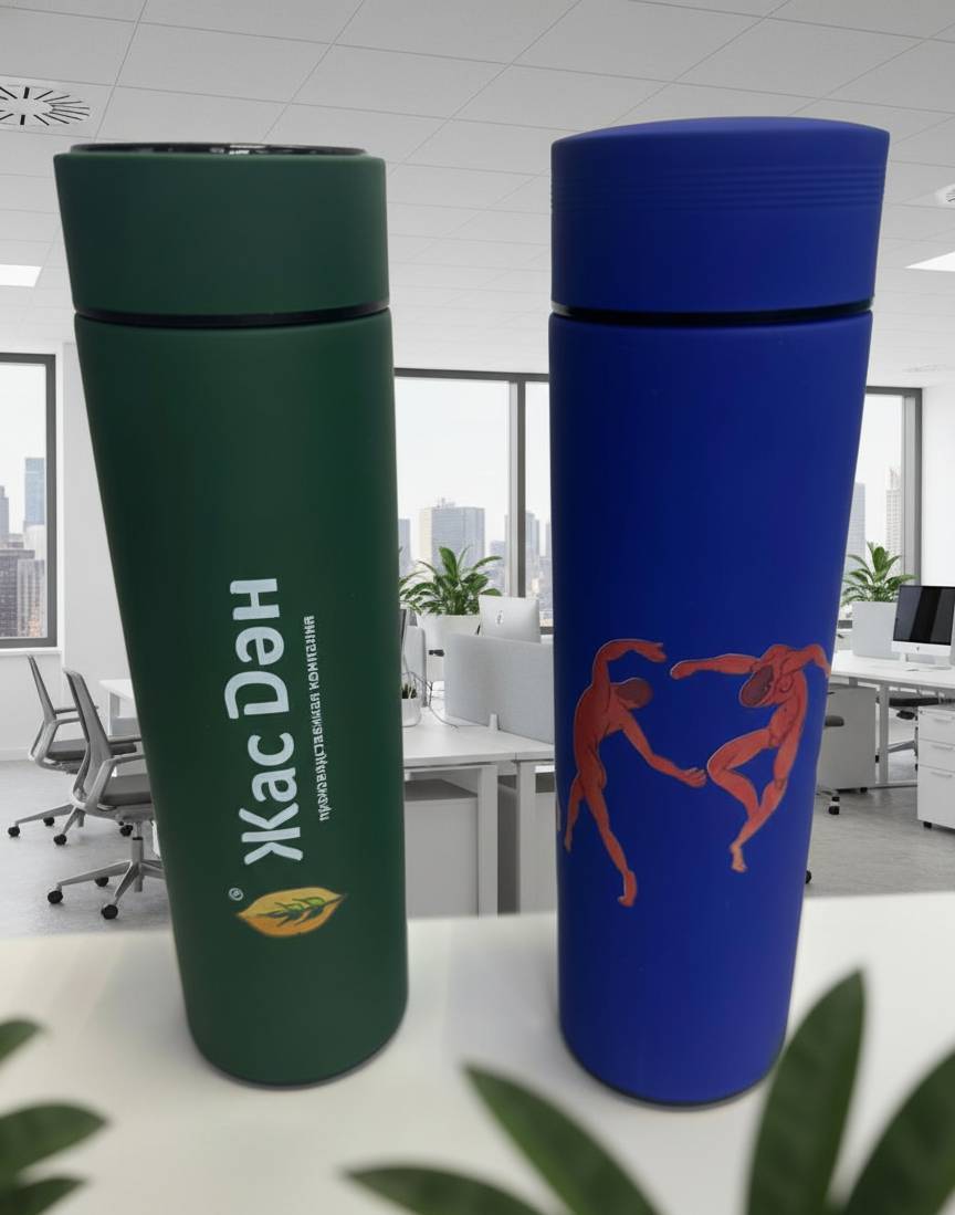 Круговая УФ-печать производится на отдельном оборудовании и позволяет запечатать бутылки, термосы и иные цилиндрические предметы полностью, по всей площади, без стыка и прерывания картинки. На прозрачных бутылках можно печатать так, что вы будете видеть полноцветное изображение и с внутренней стороны, и с наружной, причем изображения эти могут быть разными.