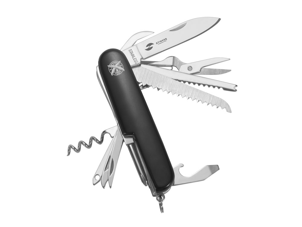 Нож перочинный STINGER имеет 15 функций: 1. Большое лезвие 2. Пила по дереву 3. Инструмент для чистки рыбы с: 4. - Инструментом для извлечения рыболовного крючка 5. Ножницы 6. Консервный нож 7. Открывалка для бутылок с: 8. - Отверткой 9. Крестовая отвертка 10. Ледокол 11. Пилка для ногтей с: 12. - Инструментом по уходу за ногтями 13. Игла 14. Штопор 15. Кольцо для ключей ХАРАКТЕРИСТИКИ Материалы: • лезвие/инструменты: нержавеющая сталь AISI 420, твердость 44-48 HRC • рукоять: нержавеющая сталь AISI 420, твердость 44-48 HRC • накладки рукояти: АБС-пластик Размер: 89 мм Вес: 110 г Цвет накладок рукояти: черный Накладки рукояти ножа не подлежат замене. Упаковка: картонная коробка