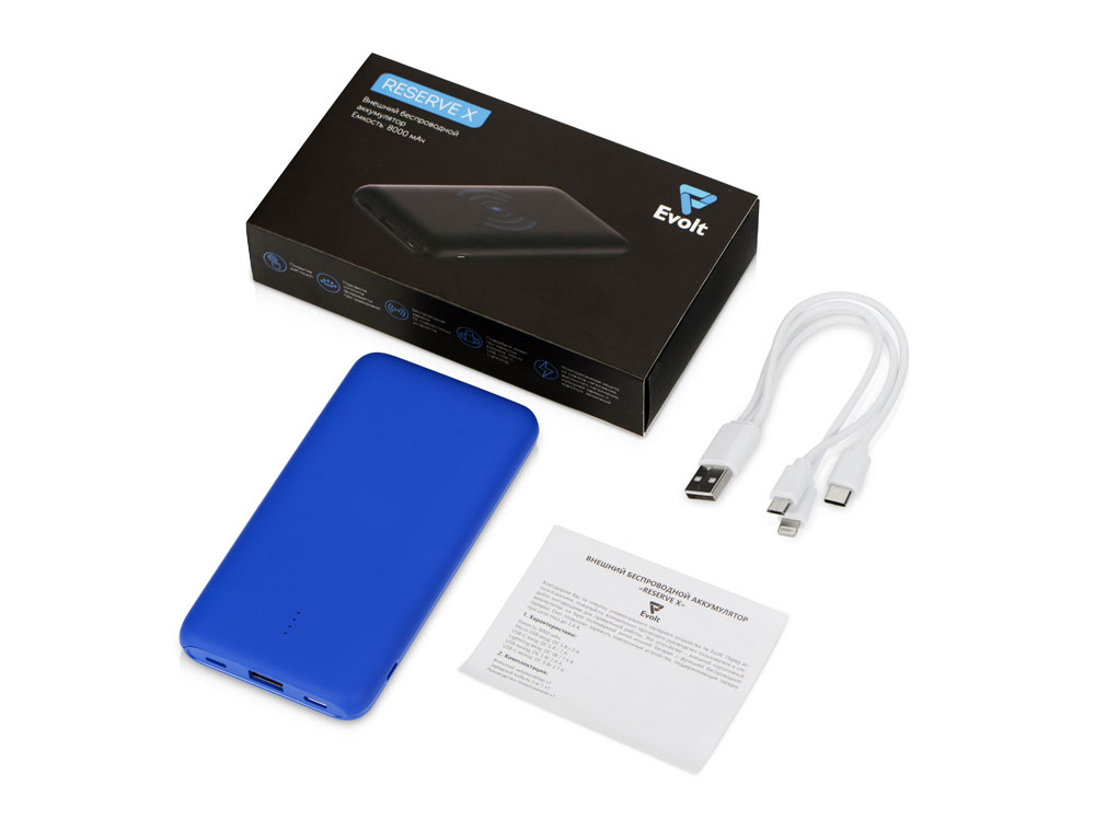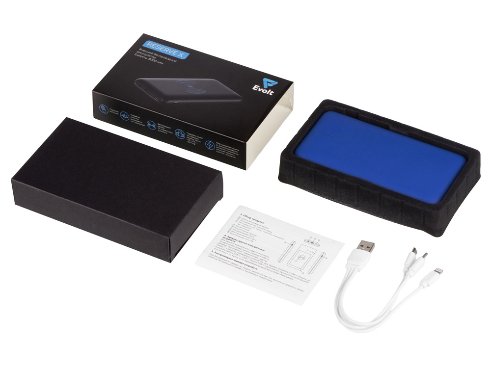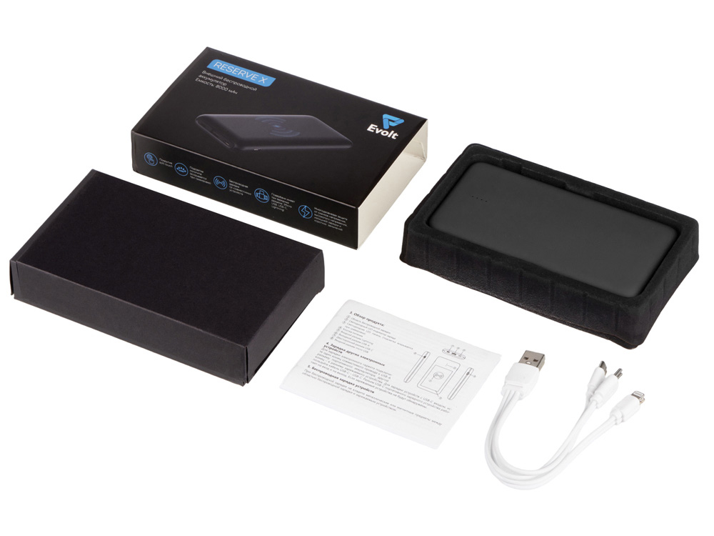 Корпус внешнего беспроводного аккумулятора Reserve X от Evolt покрыт soft touch, а при гравировке открывает подсветку логотипа. Гравировку можно компоновать с УФ-печатью, что позволит создать интересное сочетание подсвеченного контура и цветного изображения. Это — не единственный плюс: Reserve X имеет беспроводную зарядку Qi-совместимых устройств, а еще — многоуровневую защиту от нестабильного напряжения и замыканий, которая обезопасит и аккумулятор, и заряжаемый гаджет. Зарядить повербанк можно через 3 порта, зарядить от него устройство — через 2. - подсветка открывается при гравировке - беспроводная зарядка - три зарядных разъема — Micro USB, USB-C, Lightning для зарядки повербанка - заряжать гаджеты от повербанка можно через порт USB-C (он двунаправленный) и USB-A - защита от нестабильного напряжения, коротких замыканий и излишней зарядки, которая обезопасит и подключенное устройство, и сам повербанк